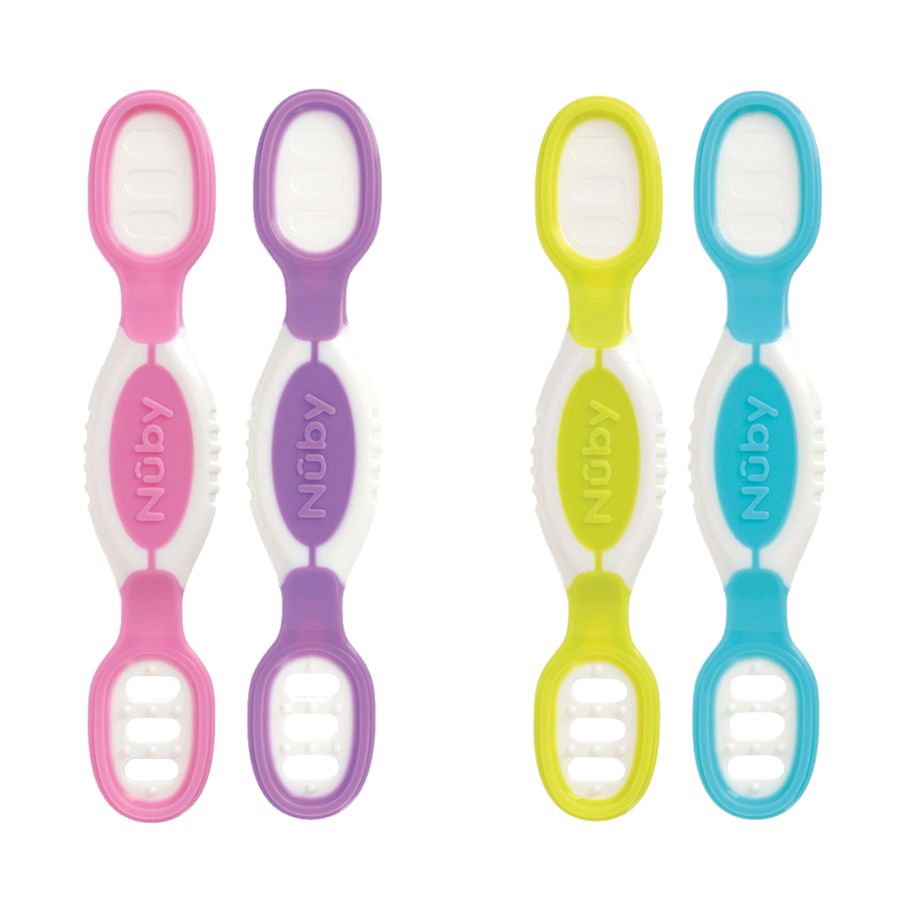 Cucharas Nuby Dip & Scoop diseñadas para bebés de 6 meses en adelante. Con puntas especiales para alimentos semisólidos y mangos fáciles de sostener, ideales para promover la autoalimentación. Incluye 2 piezas libres de BPA.