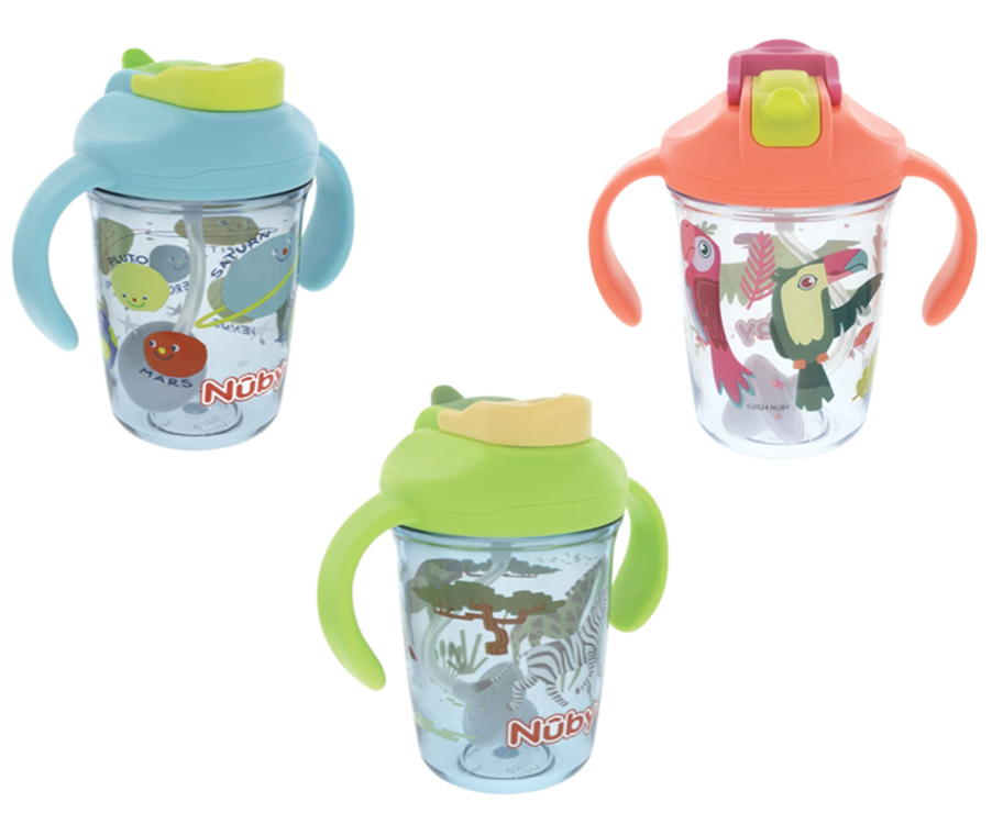 Su tapa abatible mantiene el popote limpio, mientras que las asas ergonómicas están hechas para que hasta las manos más pequeñas puedan sujetarlo cómodamente. Con capacidad de 8 oz / 240 ml, materiales libres de BPA y un divertido diseño de aves tropicales, este vaso es práctico, seguro y perfecto para usar dentro y fuera de casa.